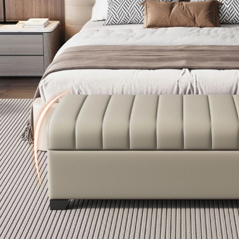 Channel-tufted faux leather bench with bed bench appeal in tan, bench with storage  Backless sofa bench in faux leather, 2 seater bench design Matte-finish grey bench ottoman with lift-up top and solid legs, benches and ottomans  Hidden hinge bench with rectangular shape and dark wood legs, bed bench The Massimo is a modern rectangular bench crafted for dual functionality and refined design. The sturdy construction includes a neem wood base and elastic seating support, enhanced with a hidden lift-up storage compartment.  It fits effortlessly into compact living areas, hallways, or as an end-of-bed bench The clean-lined profile suits contemporary interiors, doubling up as a 2 seater bench or bench ottoman. Built with soft-close hinges and block wood legs, it supports urban lifestyles seeking neatness and durability.