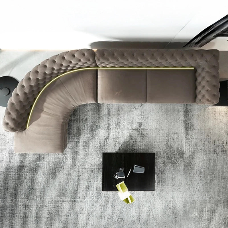 This Polonium couch blends the opulence of a Chesterfield with the relaxed elegance of a modern l shaped sofa. Wrapped in rich velvet upholstery, it features a symmetrical curved layout ideal for luxury apartments or villa lounges.