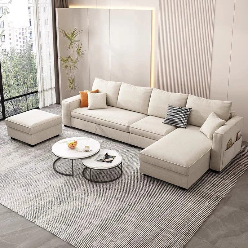 Pull-out convertible sofa bed couch with ottoman stool and storage chaise, fabric finish